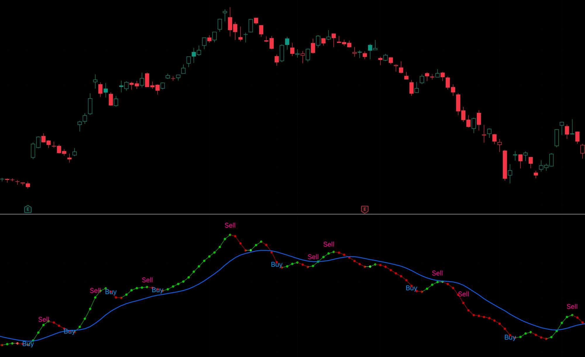 Dot 在副图上显示两个核心元素。圆点序列追踪短期价格动能——绿色圆点代表上涨动能,颜色越深动能越强;红色圆点代表下跌动能,颜色越深下跌越有力;圆点之间用同色线段连接,让动能的轨迹连续清晰。蓝色基准线追踪中长期趋势的主方向,走势平稳,为圆点序列提供方向参考。