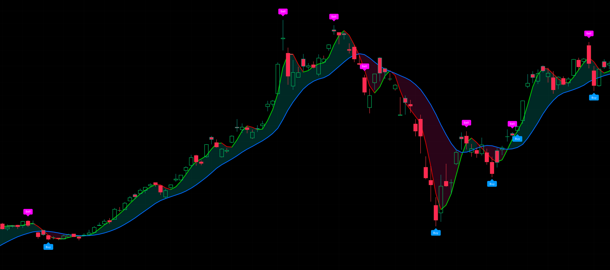 Alpha 在主图上同时显示两条动态量化通道,两条通道之间的填充区域直接告诉你当前的趋势格局。当小周期动能线运行在大周期基准线上方,两线之间填充绿色,代表趋势向上、上升通道成立;当小周期动能线跌破大周期基准线,填充转为深红色,代表趋势反转向下、下降通道成立。与此同时,小周期动能线本身的颜色也携带信息——绿色代表短期上涨动能,红色代表短期下跌动能。系统在关键高低点自动标出 Buy 和 Sell 信号。
